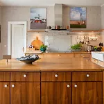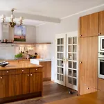 A fully furnished kitchen at the Harmsdorf villa is equipped with an electric kettle, a fridge, and kitchenware. The 3-bathroom villa is also 65 km from Lubeck airport.